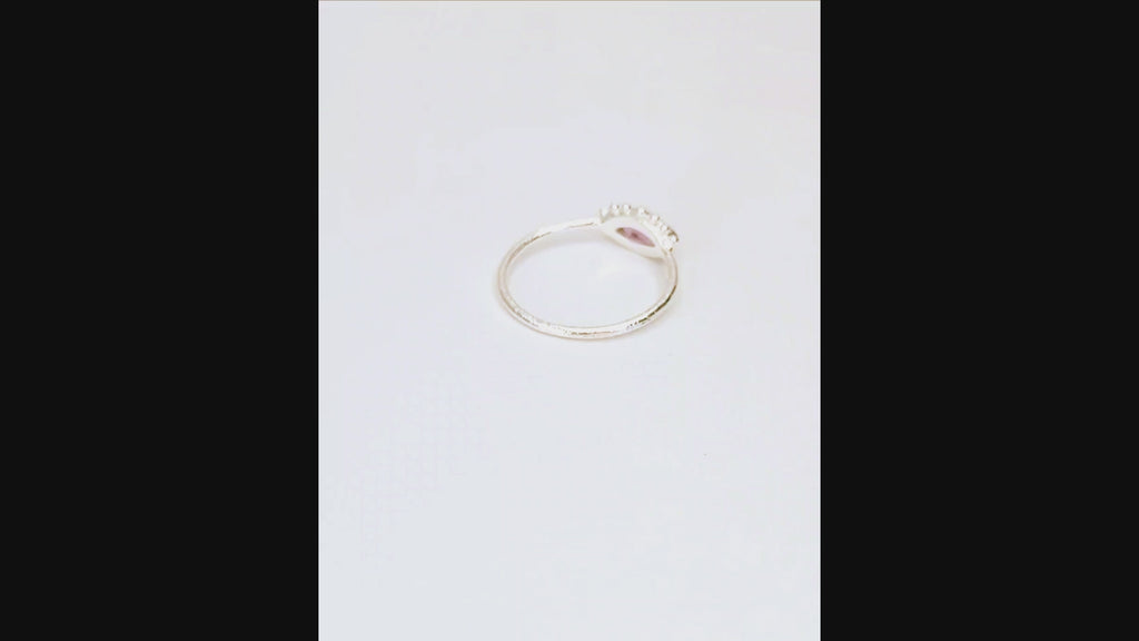 The Evil Eye is a powerful symbol of protection, said to shield the wearer from negativity and promote clarity and spiritual strength. This sterling silver ring features a marquise-cut amethyst at the center—representing intuition and calm—set in a delicate eye-inspired design.